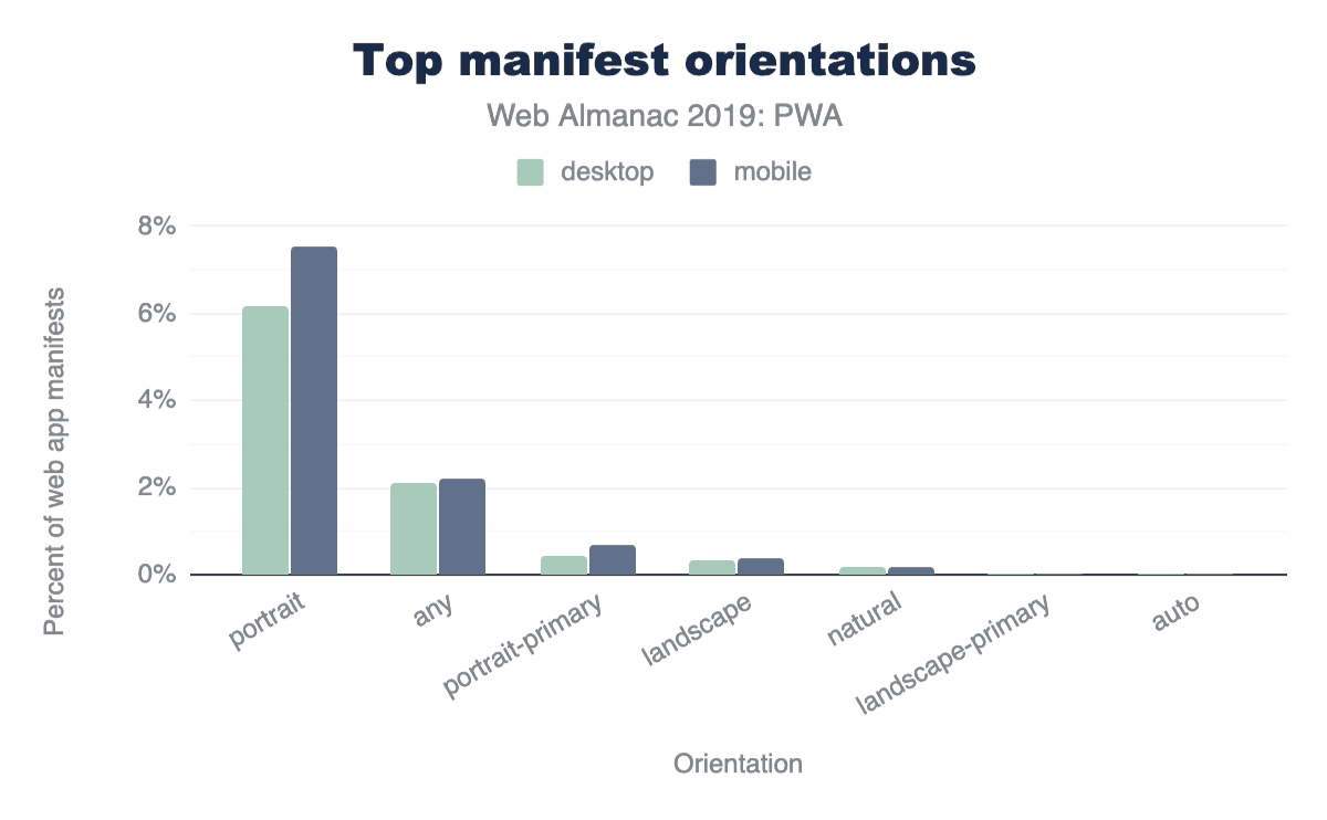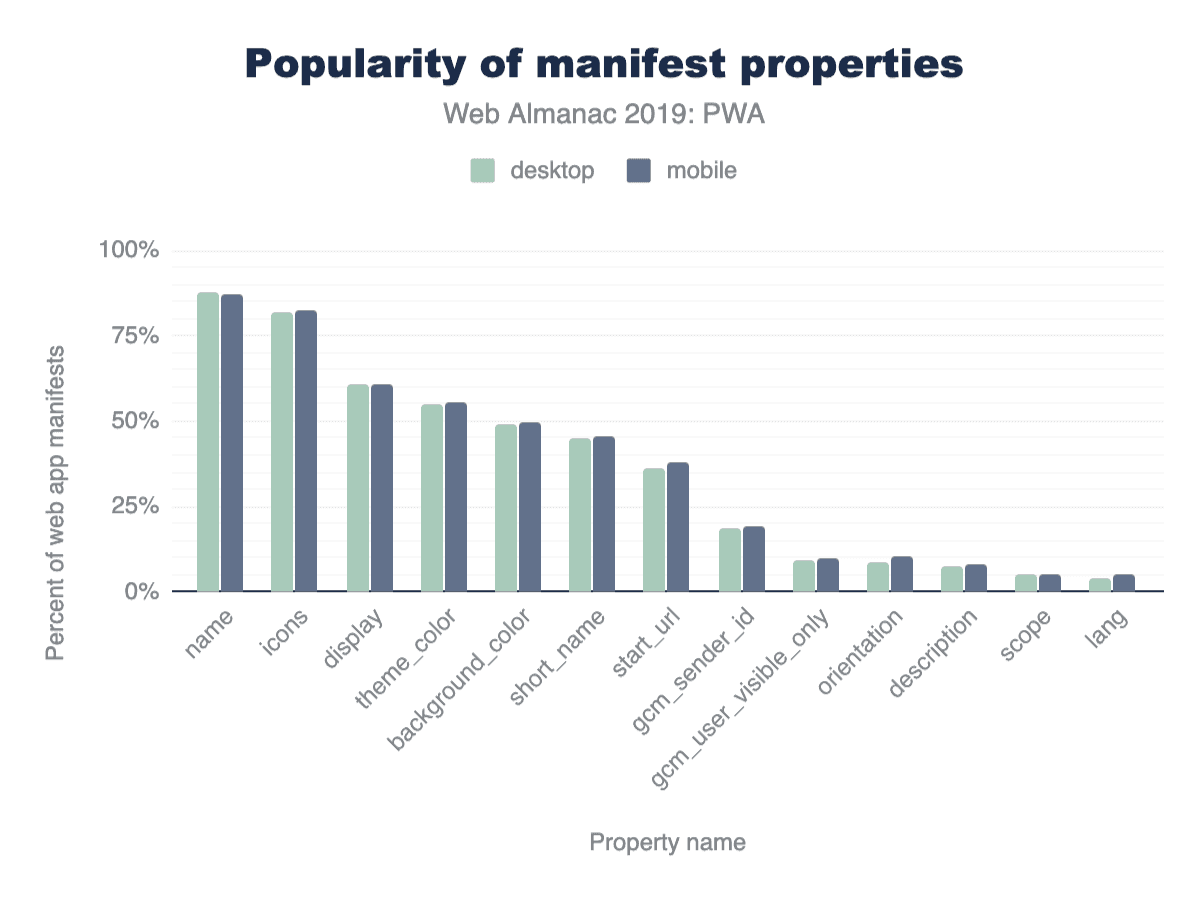The web app manifest is a simple JSON file that tells the browser about a web application and how it should behave when installed on the user’s mobile device or desktop. A typical manifest file includes information about the app name, icons it should use, the start URL it should open at when launched, and more. Only 1.54% of all encountered manifests were invalid JSON, and the rest parsed correctly.