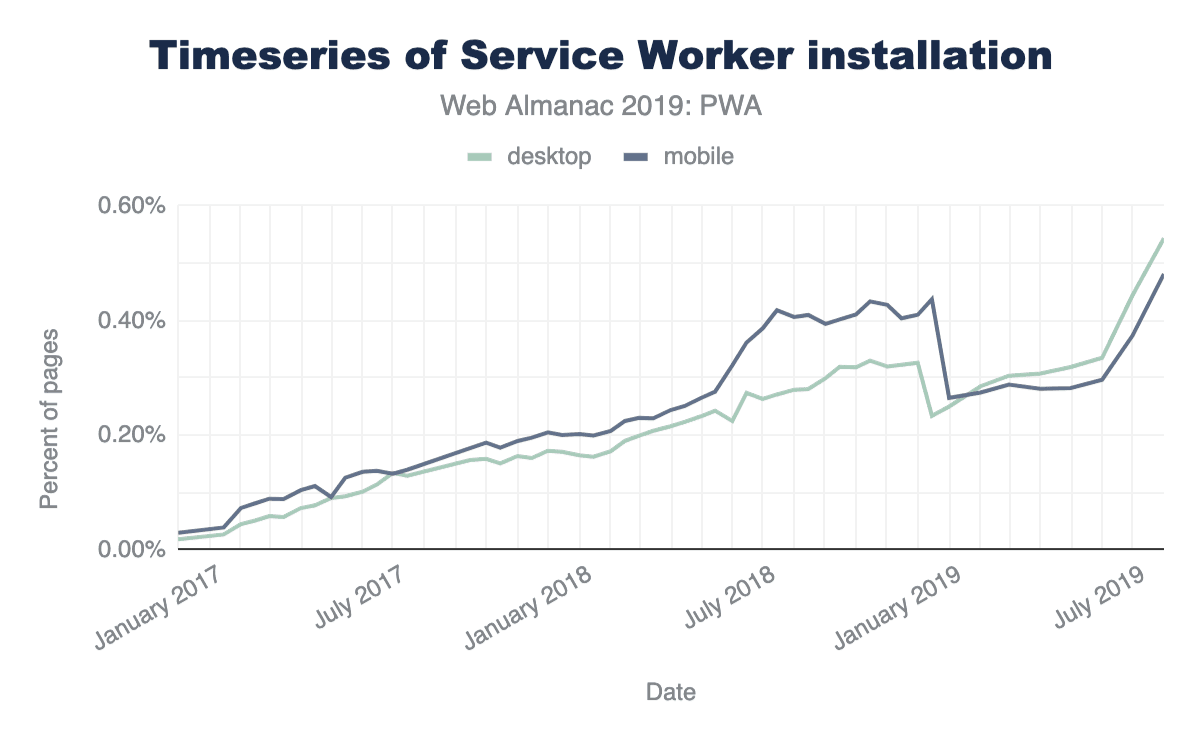The first metric we explore are service worker installations. Looking at the data exposed through feature counters in the HTTP Archive, we find that 0.44% of all desktop and 0.37% of all mobile pages register a service worker, and both curves over time are steeply growing.
