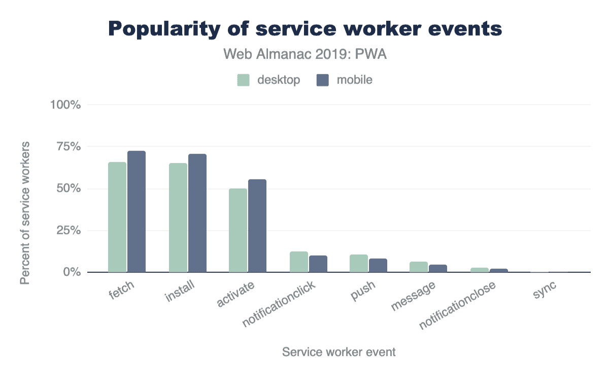 We have examined which of these events are being listened to by service workers we could find in the HTTP Archive. The results for mobile and desktop are very similar with fetch, install, and activate being the three most popular events, followed by notificationclick and push. If we interpret these results, offline use cases that service workers enable are the most attractive feature for app developers, far ahead of push notifications. Due to its limited availability, and less common use case, background sync doesn’t play a significant role at the moment.