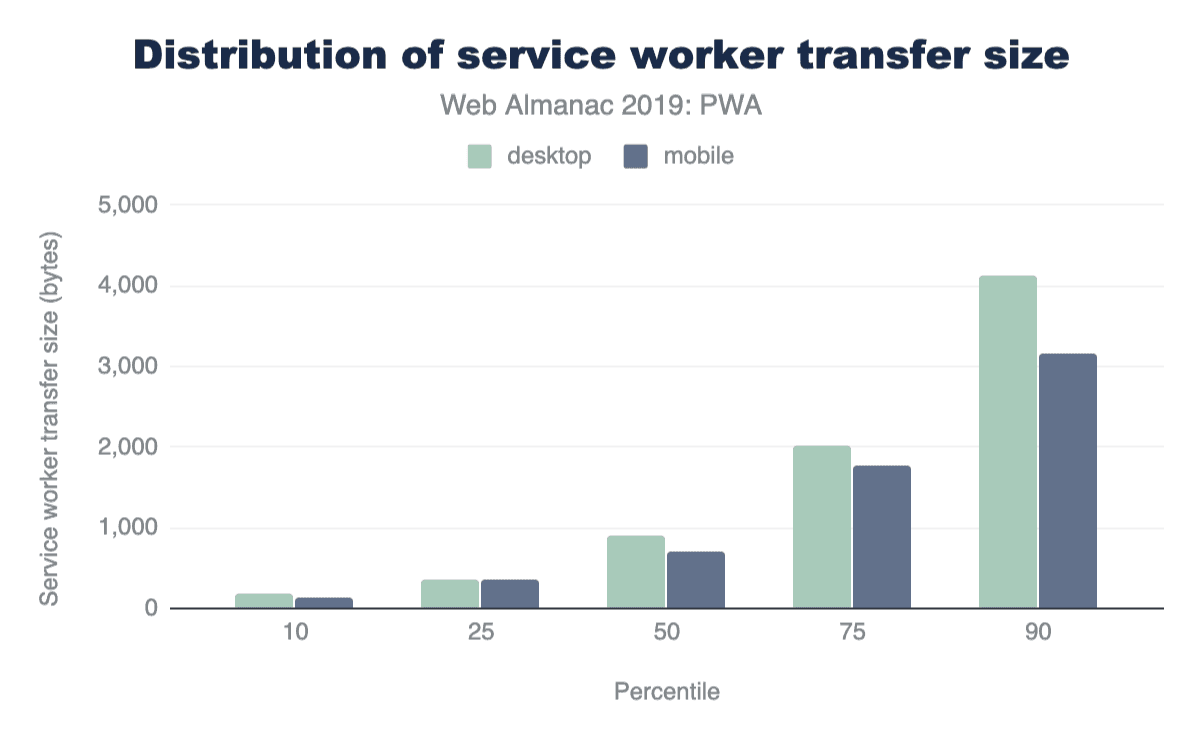 The median service worker file on desktop is 895 bytes, whereas on mobile it’s 694 bytes. Throughout all percentiles desktop service workers are larger than mobile service workers. We note that these stats don’t account for dynamically imported scripts through the importScripts() method, which likely skews the results higher.