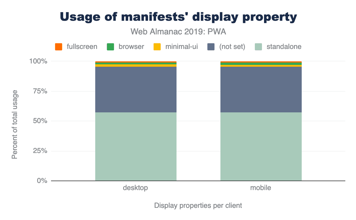 Looking at the values developers set for the display property, it becomes immediately clear that they want PWAs to be perceived as “proper” apps that don’t reveal their web technology origins.