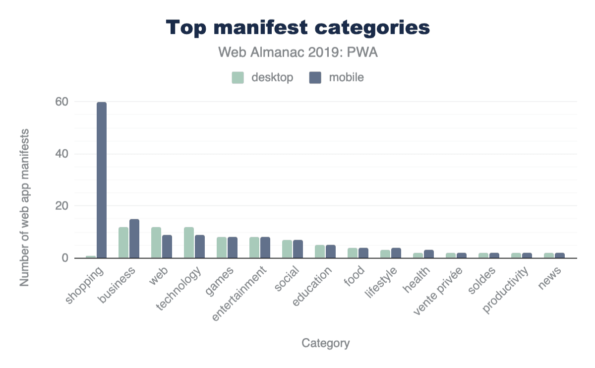 There were not too many manifests that made use of the property, but it is interesting to see the shift from “shopping” being the most popular category on mobile to “business”, “technology”, and “web” (whatever may be meant with that) on desktop that share the first place evenly.
