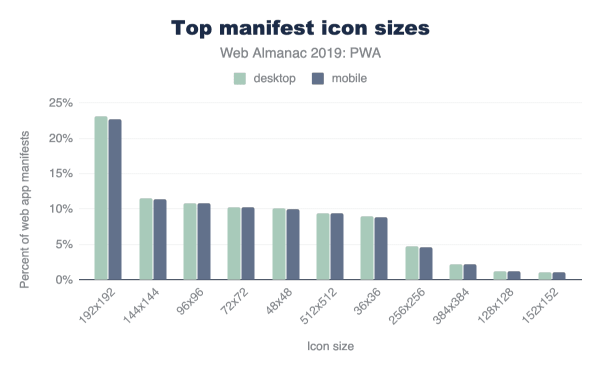 Lighthouse’s rule is probably the culprit for 192 pixels being the most popular choice of icon size on both desktop and mobile, despite Google’s documentation explicitly recommending 512x512, which doesn’t show as a particularly prominent option.
