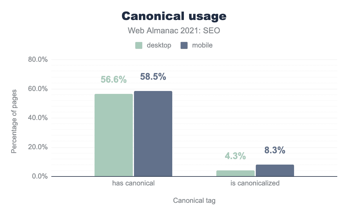 The data shows increased adoption of canonical tags over the years. For example, 2019’s edition shows that 48.3% of mobile pages were using a canonical tag. In 2020’s edition, the percentage grew to 53.6%, and in 2021 we see 58.5%.