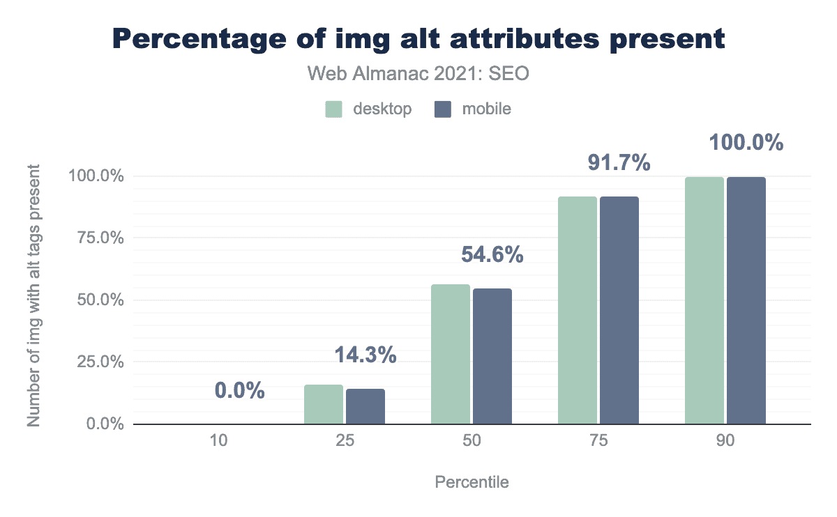 alt attributes present per percentile (10, 25, 50, 75, and 90). Our data found the median web page contained 54.6% of images with an alt attribute on mobile pages and 56.5% on desktop pages.alt attributes.