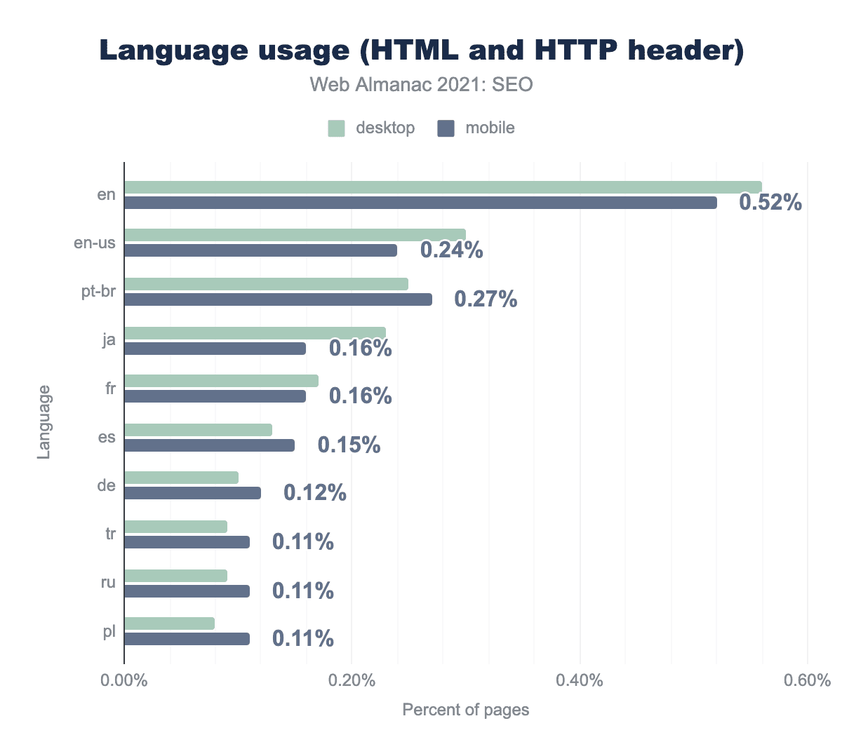 en (English version) and hreflang attributes (across all languages) were implemented on less than 5% of desktop and mobile pages.9.0% of desktop pages and 8.4% of mobile pages use the hreflang attribute.