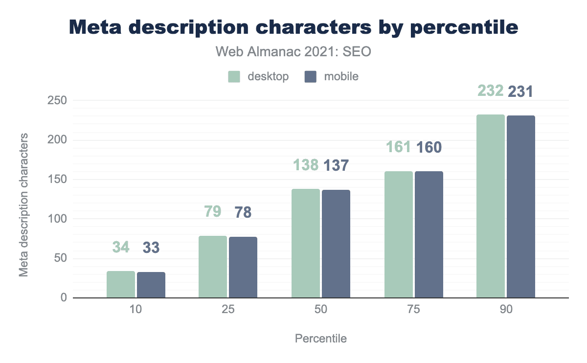 <meta name="description>tag contained 138 and 127 characters, respectively. - 10% of desktop and mobile pages had