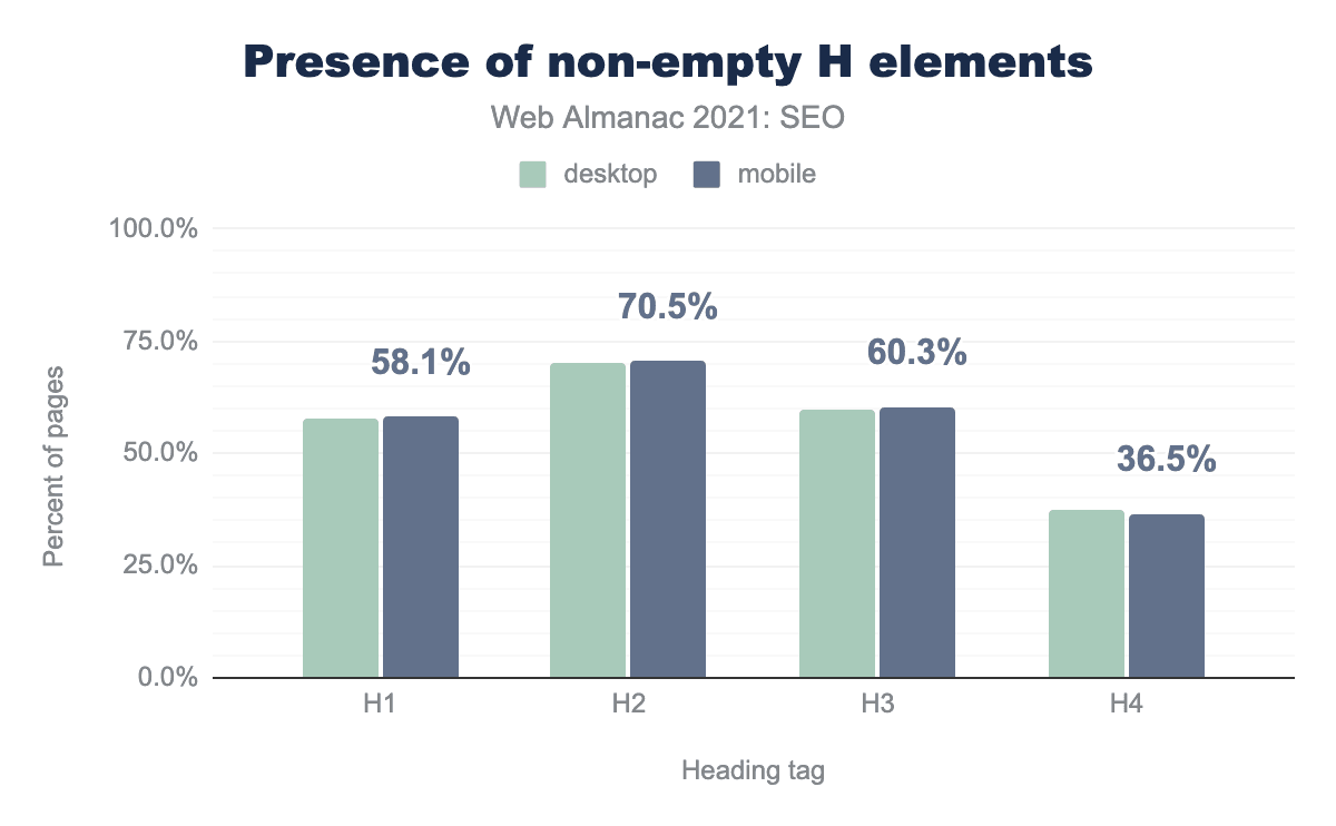 <h> elements by heading tag (level 1, 2, 3, 4). There was little to no difference between desktop and mobile results. h1 headings were found on 58.1% of pages, h2s were found the most frequently on 70.5% of pages, h3s on 60.3% of pages and h4 headings were found on 36.5% of pages.However, a lower percentage of pages include non-empty<h> elements, particularly h1. Websites often wrap logo-images in <h1> elements on home pages, and this may explain the discrepancy.
