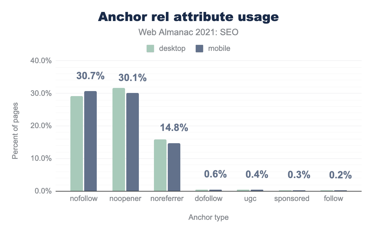 rel="noopener" was featured on 31.6% of desktop pages and 30.1% on mobile. rel="noreferrer" was featured on 15.8% of desktop pages and 14.8% of mobile. rel="dofollow", rel="ugc", rel="sponsored", and rel="follow" were all featured on fewer than 1% of desktop and mobile pages.The new attributes are still fairly rare, at least on home pages, with rel="ugc" appearing on 0.4% of mobile pages and rel="sponsored" appearing on 0.3% of mobile pages. It’s likely these attributes are seeing more adoption on pages that aren’t home pages.