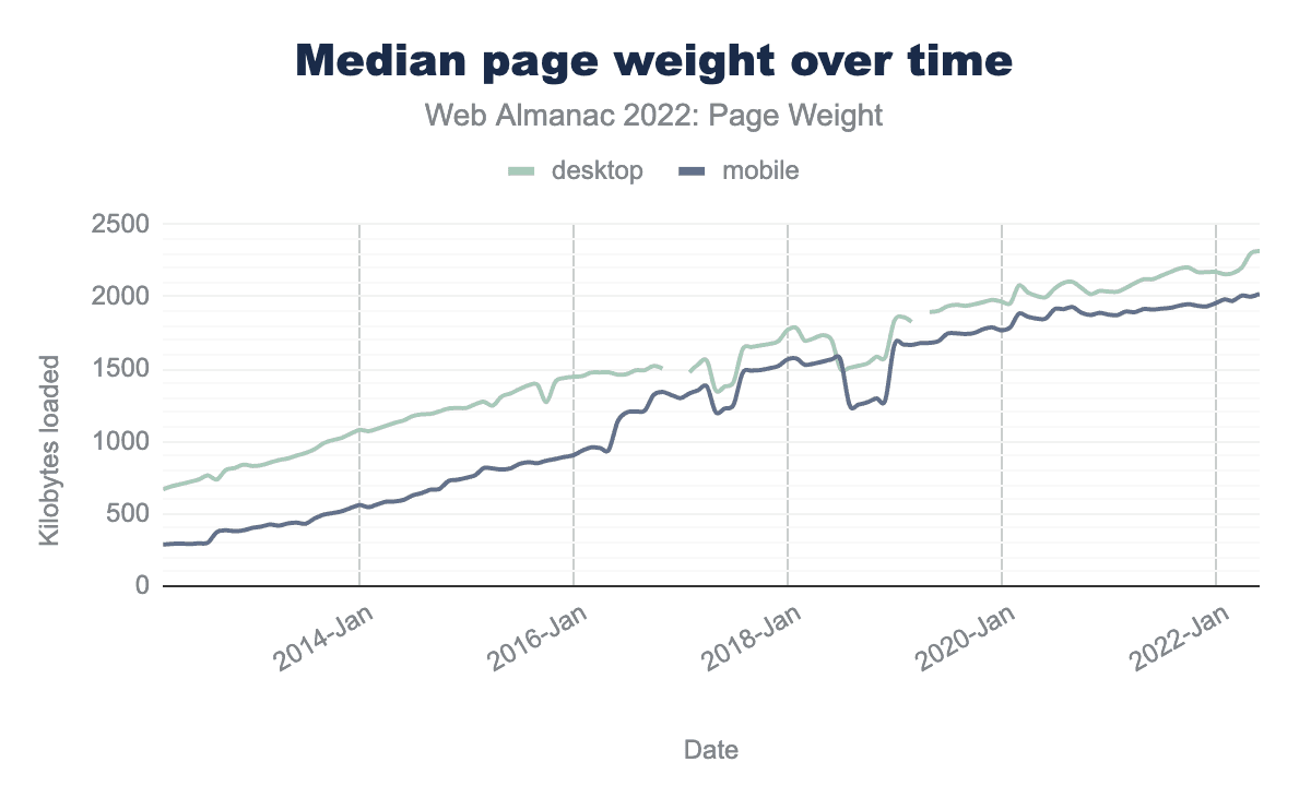 In the 10-year period between June 2012 to June 2022, the median page weight increased by 221%, or 1.6 MB, for desktop page loads, 594%, or 1.7 MB for mobile page loads