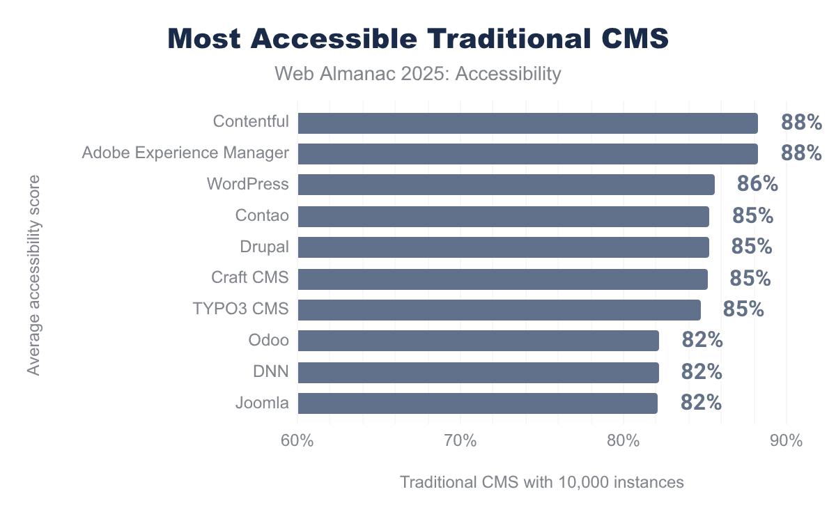 The data proves that CMS choice meaningfully impacts accessibility outcomes, even when content creators must take final responsibility for some decisions. Platforms with stricter design constraints and embedded accessibility defaults perform better, while those offering maximum flexibility leave accessibility decisions to users.