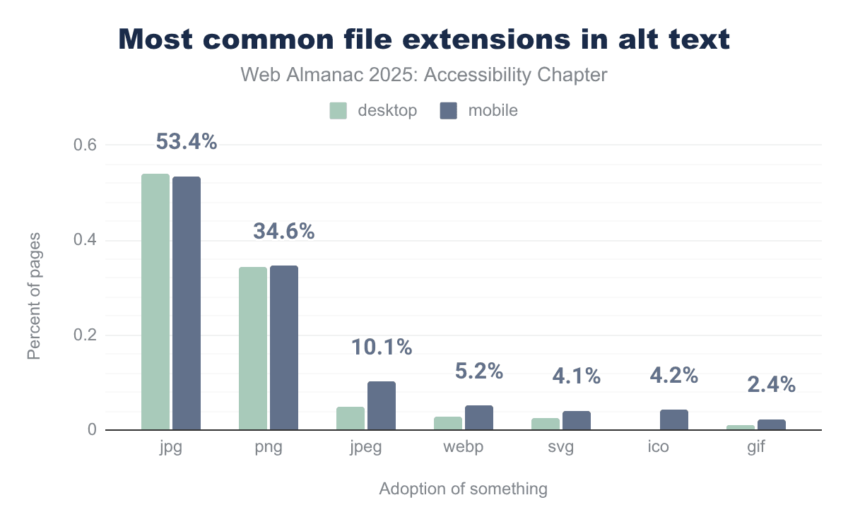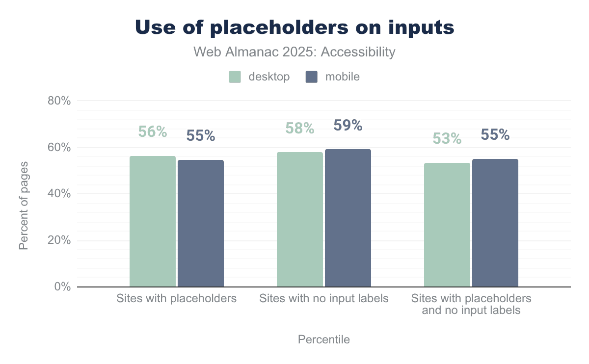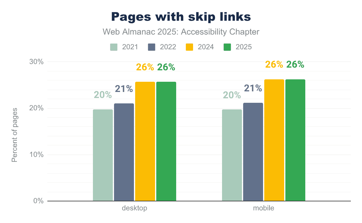 This year, text contrast pass rate improved by roughly 1% compared to 2024. But only 31% of mobile sites currently meet minimum color contrast requirements. Since mobile experiences depend heavily on clear visibility, this gap is a real problem for users accessing the web on their phones.